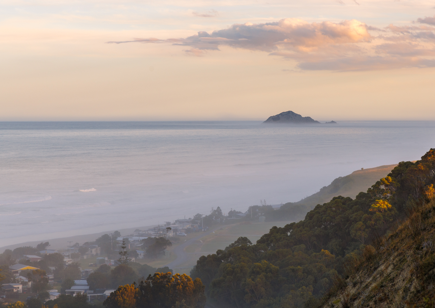 A beautiful foggy autumn sunset over Ocean Beach, Havelock North, with a mix of soft pastel colours and vibrant autumn tones.