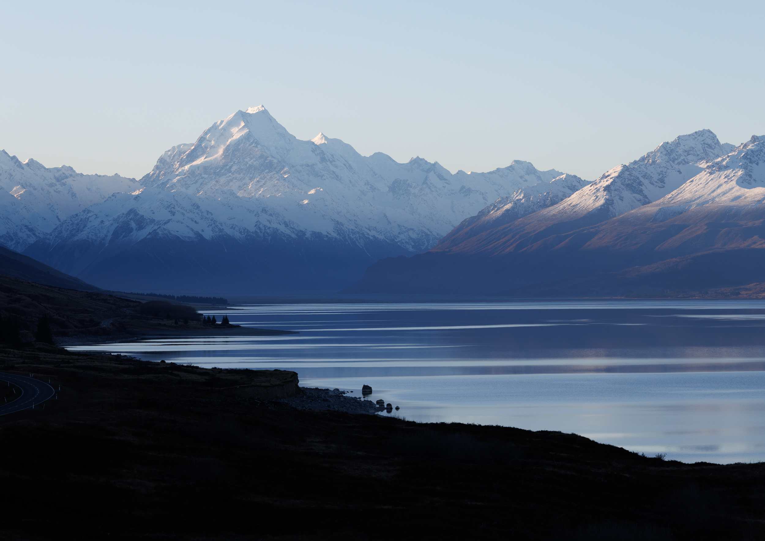 This image of Aoraki / Mt Cook was taken in the evening with the dark shadows leading up to the beautiful snowy mountain.