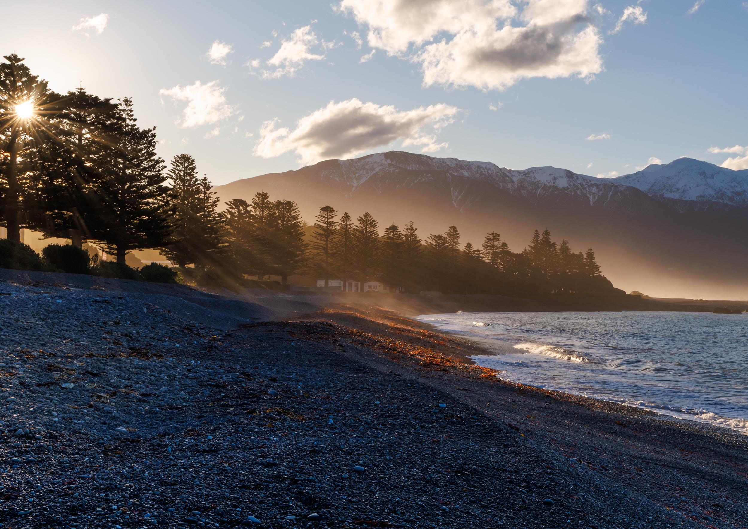 Kaikoura Beach ast golden hour with rays of light streaming through the trees.